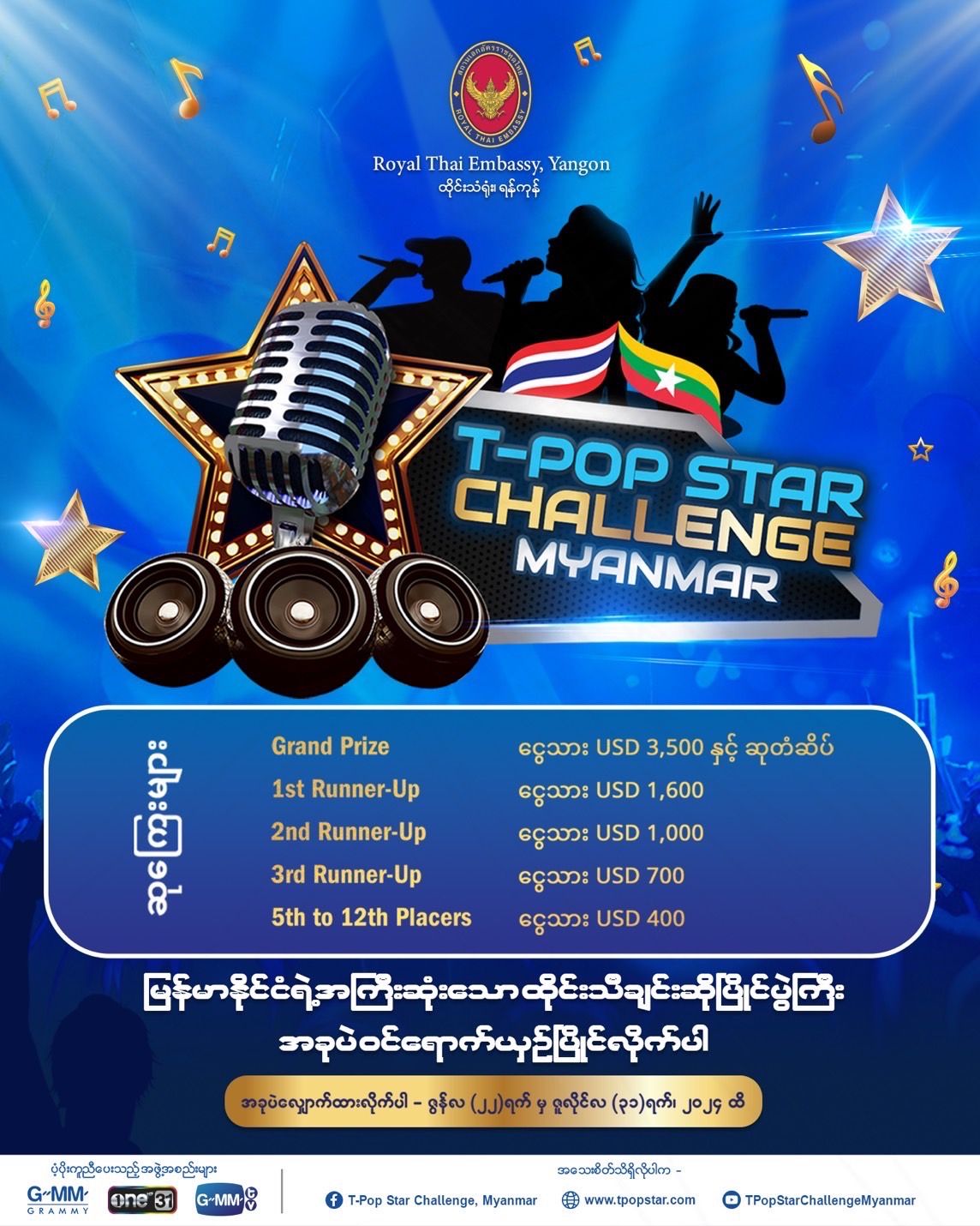 T-Pop Star Challenge, Myanmar, is the first Thai music singing competition in Myanmar organized by Royal Thai Embassy, Yangon, to promote “Thai soft power” of Thai music and Thai language among Myanmar people as well as close relationship between the peoples of Thailand and Myanmar. The winner of the contest will receive 3,500 USD cash and trophy. The event is also supported by GMM Grammy, ONE31 and GMMTV, the biggest entertainment, music and series production companies in Thailand.