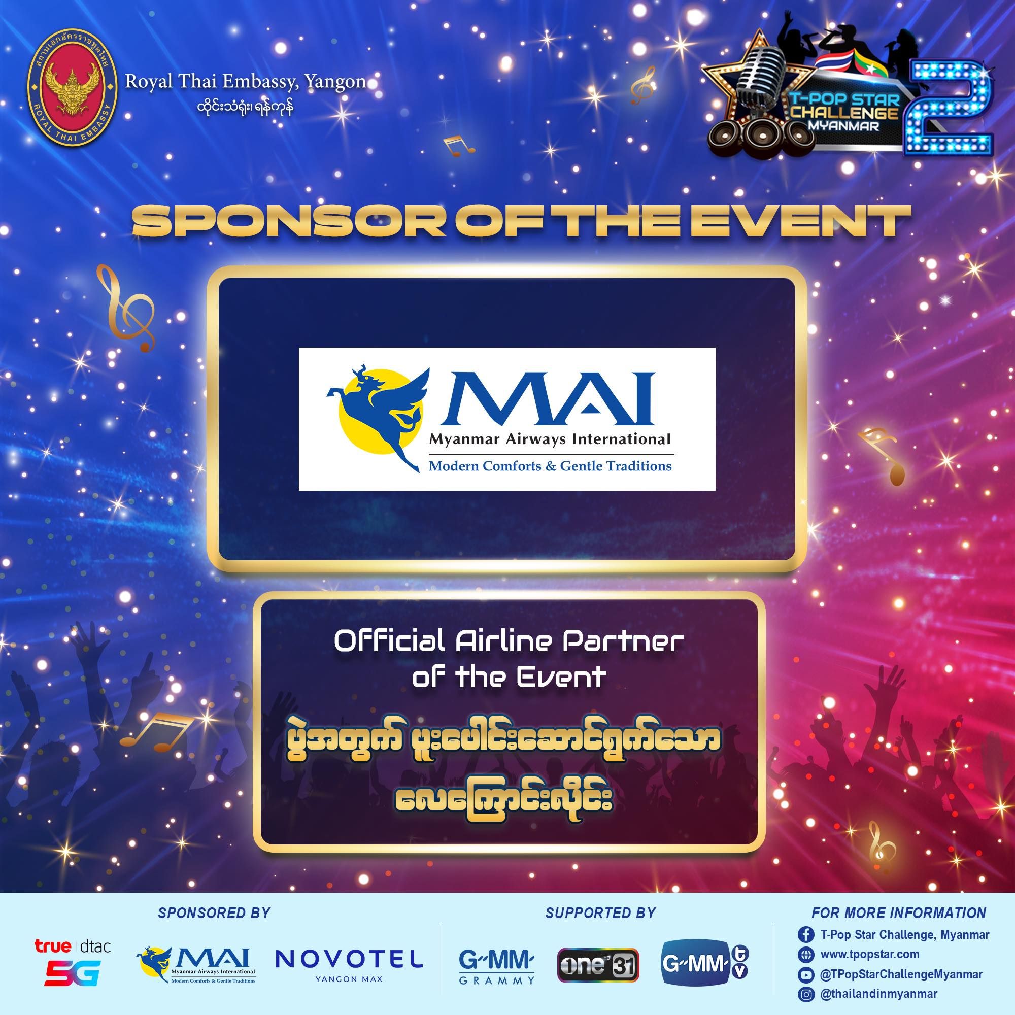 ✨ T-Pop Star Challenge, Myanmar Season 2 ပွဲအတွက် ပူးပေါင်းဆောင်ရွက်ထားသောလေကြောင်းလိုင်းအဖြစ် “Myanmar Airways International (MAI)” မှပါဝင်ပံ့ပိုးကူညီထားပါသည်။