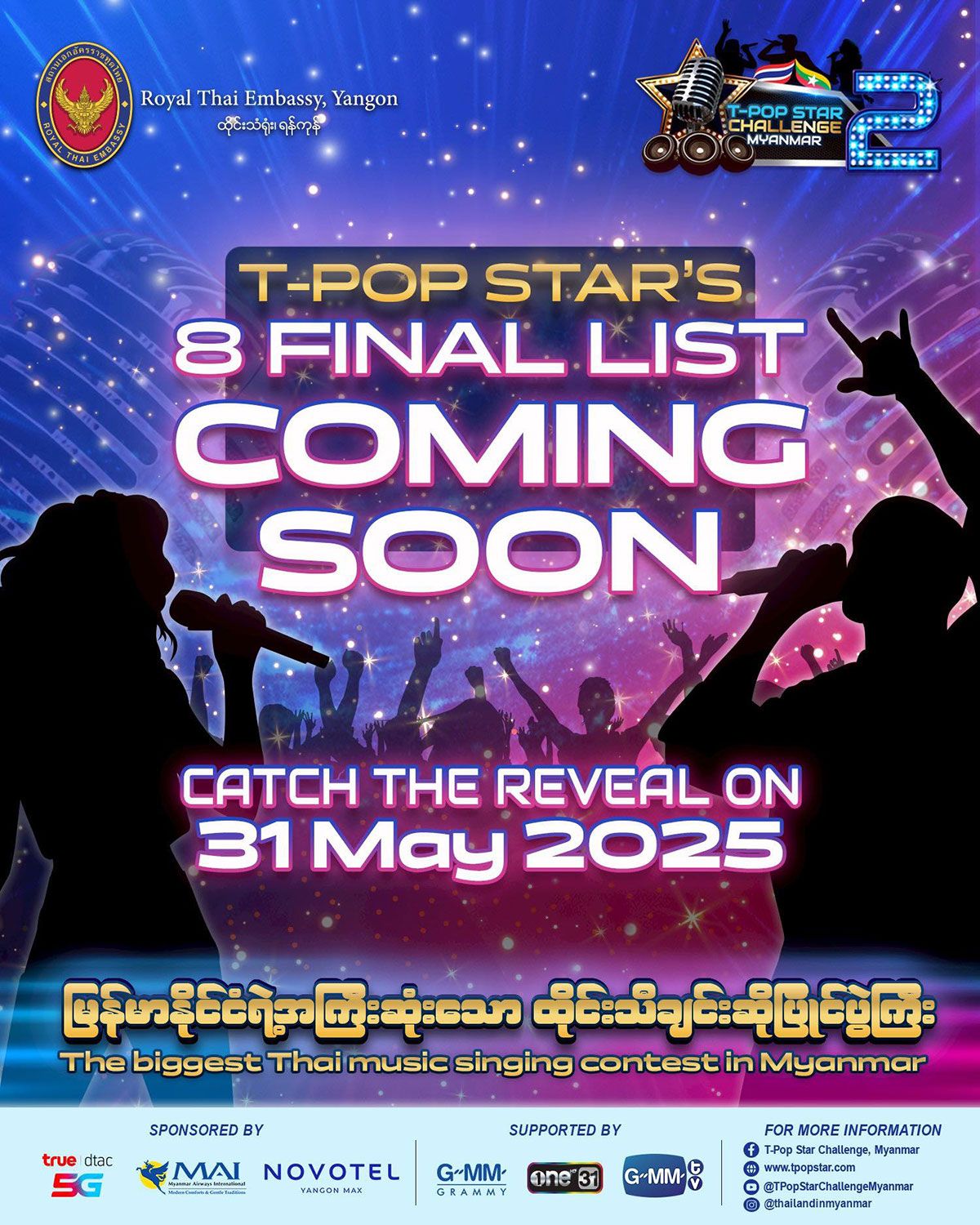 ✨ From total of 229 audition entries submitted during 27 April - 18 May 2025, on 31 May 2025, 10.00 hrs ( Myanmar time), we will to announce the top 8 contestants who would come to compete in the semi-final round of “T-Pop Star Challenge, Myanmar Season 2 on 21 June 2025 at Novotel Yangon Max! Please stay tuned!