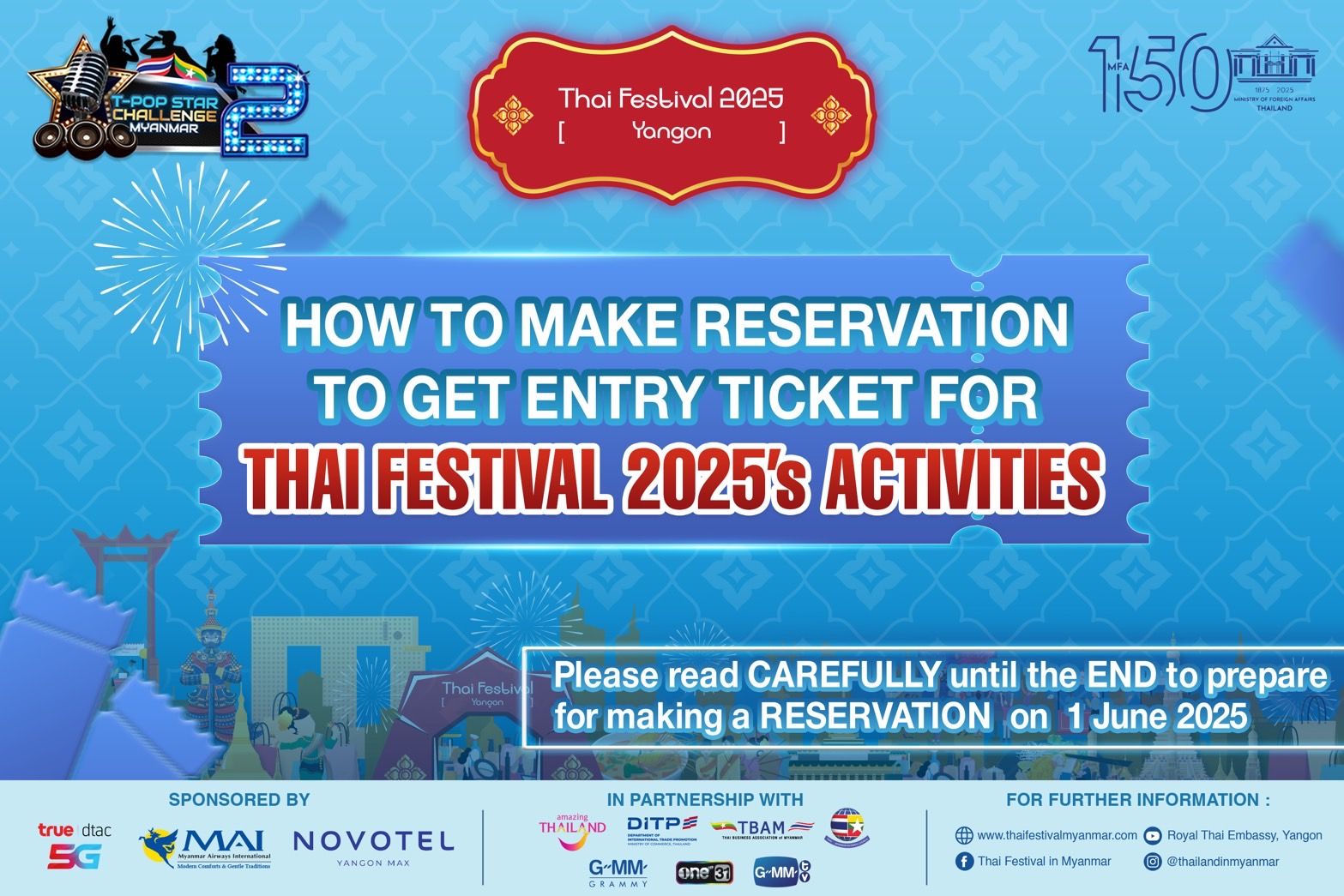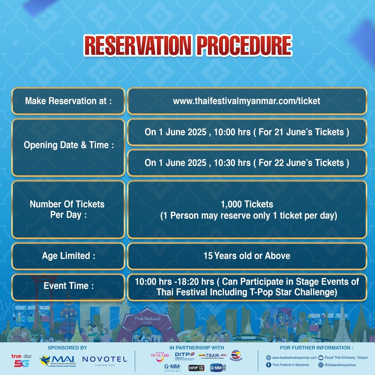 📌 The reservation can be done at www.thaifestivalmyanmar.com/ticket on 1 June 2025 (10.00 hrs for 21 June’s tickets & 10.30 hrs for 22 June’s tickets).