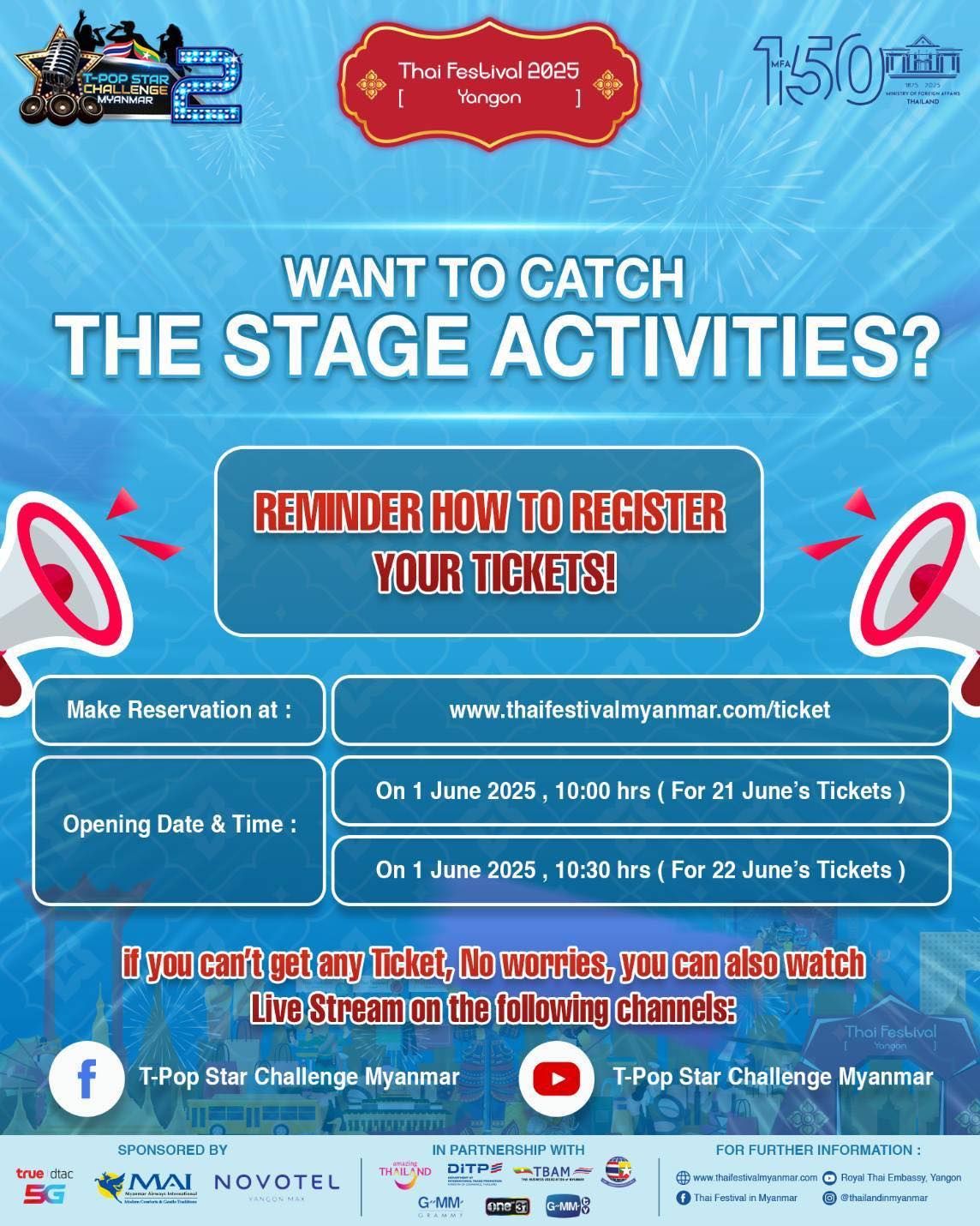 📌 For 22 June 2025's stage events, the form will appears on 1 June 2025, 10.30 am (Myanmar time) at www.thaifestivalmyanmar.com/ticket