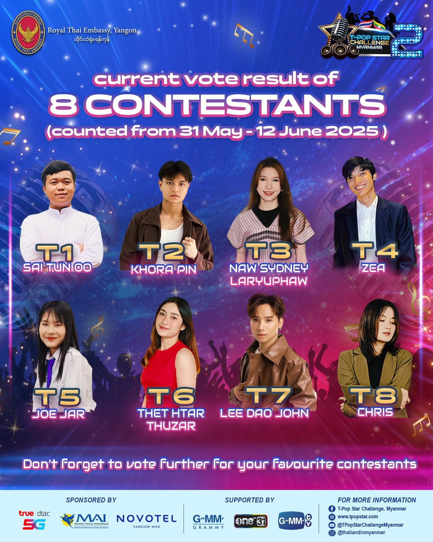 🗳️ Public voting for the 8 contestants has been open from 31 May 2025 until 12:00 noon on 14 June 2025 (Myanmar time). Voting was based on views/reactions on Facebook, YouTube, Instagram, and Daily Votes via www.tpopstar.com/2025/vote. The current voting rankings are: