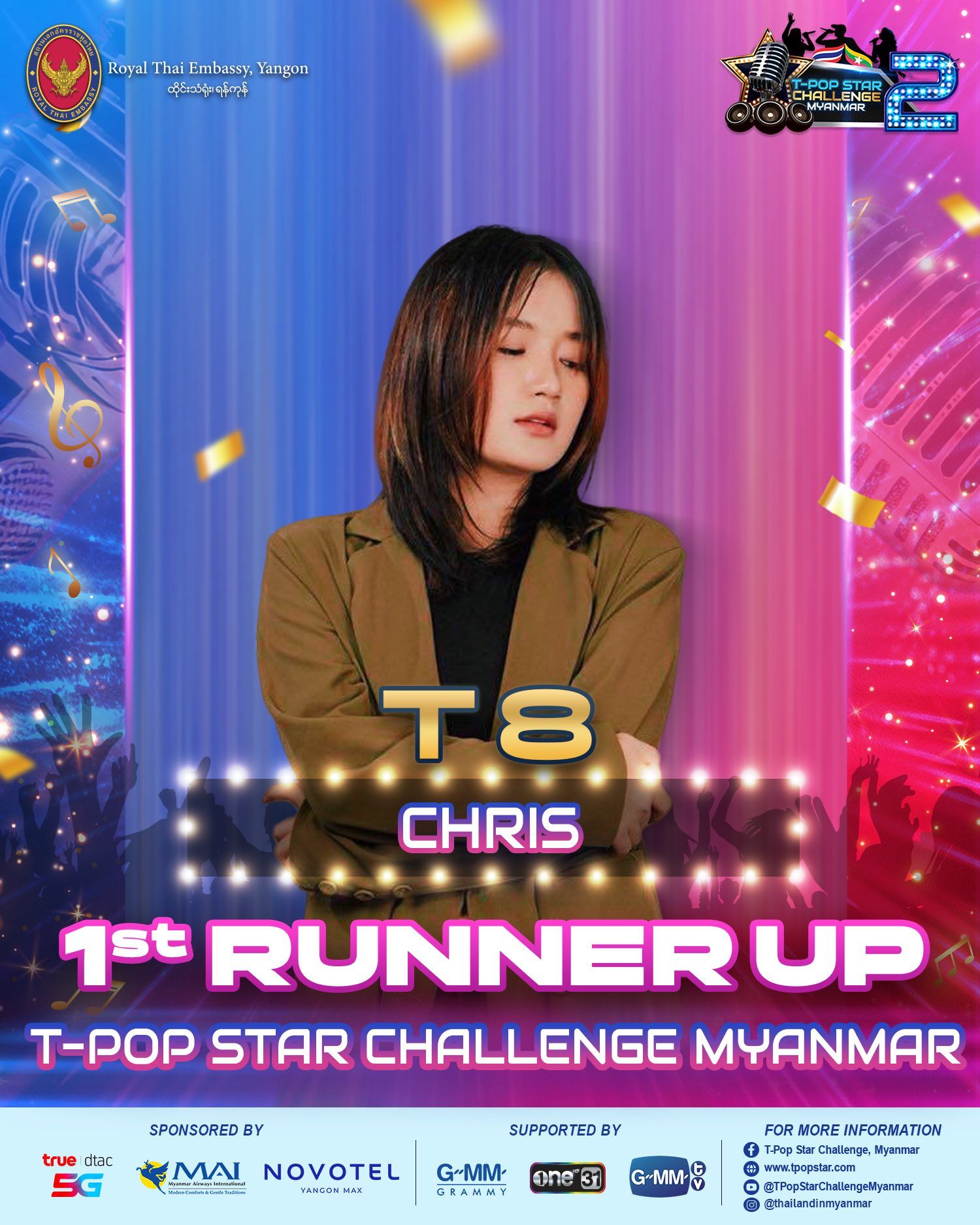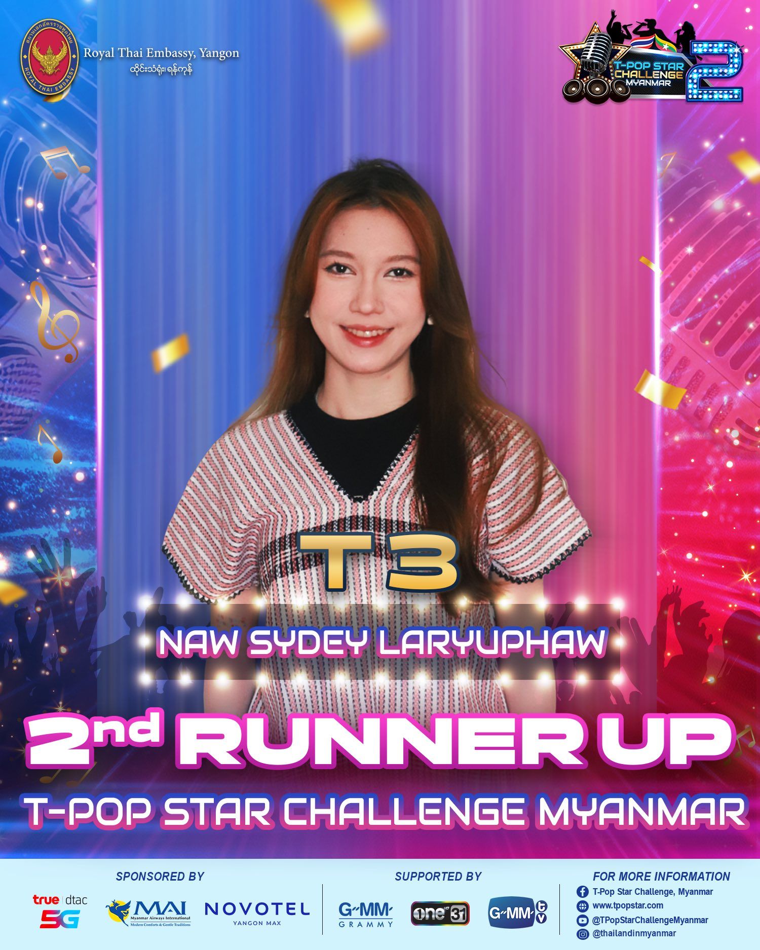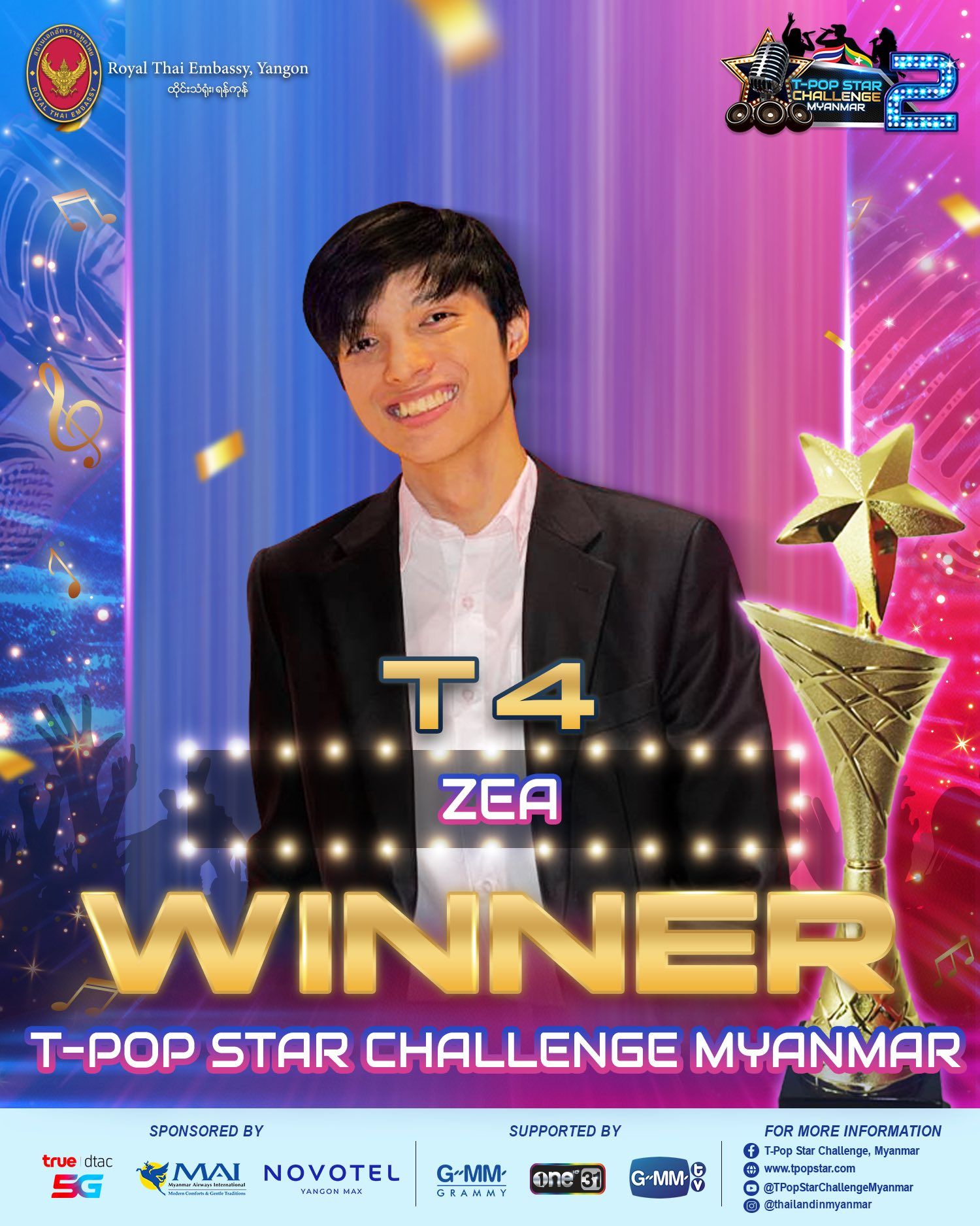 Congratulations to T4 - Zea, winner of “T-Pop Star Challenge, Myanmar Season 2”1st Runner-Up: T8 - CHRIS2nd Runner-Up: T3 - Naw Sydney Laryuphaw