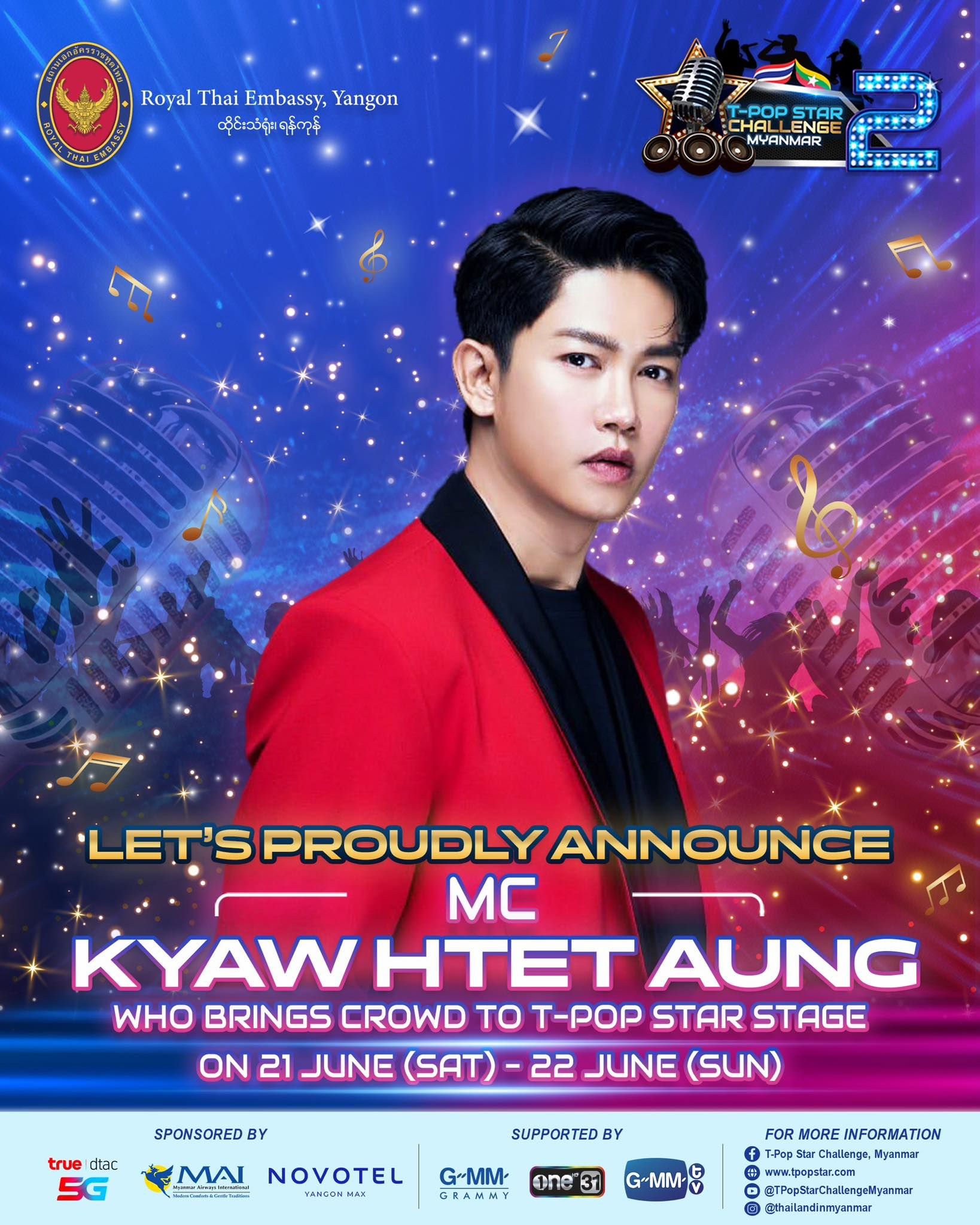 We would like to proudly announce that "Kyaw Htet Aung" will serve as a Myanmar language MC at the semi-Final and Final rounds of T-Pop Star Challenge Myanmar Season 2, on 21-22 June 2025 at Novotel Yangon Max! 💖